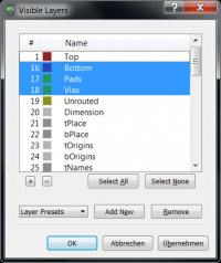The procedure for the top side of the board is the same. The mask for the top side is generated with layers 1, 17 and 18 enabled. Important: It is essential to mirror the layout, there is an extra option for this on the print menu.